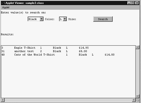 The applet checks to see whether the user selected a color and size value and uses these to modify the query string. The results are parsed with a tab character (/t) appended to add some white space between the fields. The results are then displayed in the TextArea result field.