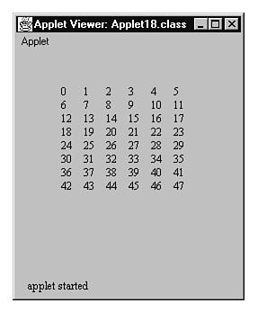 To be sure you understand how arrays work, you'll put a two-dimensional array to work in a program called Applet18. The Applet18 applet creates and initializes a two-dimensional array with six columns and eight rows. (Try to imagine the elements of this array as the rows and columns of a spreadsheet.) The program then prints the contents of the array in the Applet's display area, so you can see that the array truly holds the values to which it was initialized. Listing 13.9 is the program, whereas Figure 13.5 shows the applet running under the Appletviewer application.