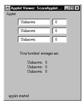 When you run Applet16, you can enter bowling scores into the three boxes at the top of the applet's display area. After you enter these averages, they're displayed on-screen as well as copied into the three variables avg1, avg2, and avg3.