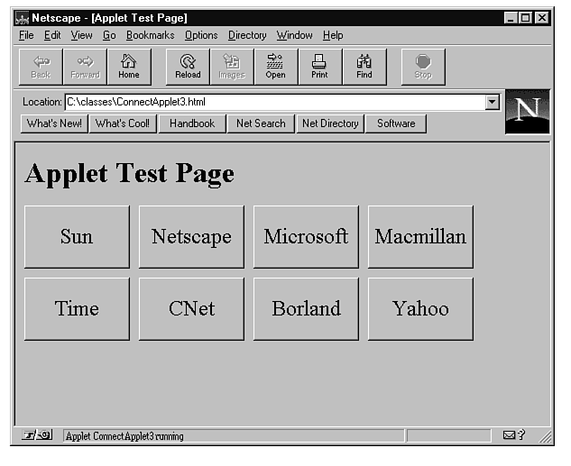 When you run the applet from Netscape Navigator 2.0, you see the window shown in Figure 28.4. As you can see, the applet currently displays four buttons, one each for the Sun, Netscape, Microsoft, and Macmillan Web sites. Just click a button to jump to the associated site. (Figure 28.5 shows the browser after the user has clicked the Macmillan button.) When you're through with that site, use the browser's Back button to return to the ConnectApplet2 applet. Then, choose another site.