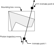 This implementation has a few limitations, the first of which is that photons must be rendered inside an asteroid's bounding box for it to be destroyed. Having a photon's trajectory pass through an asteroid will not work. This is the primary reason to limit a photon's speed to 20. Even at this speed, there will be times when you think a rock should have been hit, but the photon was rendered before and immediately after the bounding box of the asteroid. Figure 14.3 shows this phenomenon.