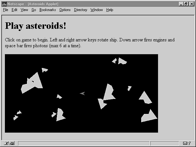 Finally, a Java Asteroid game was written to exploit the Missile class. You should now have a solid foundation in 2D game techniques. All this chapter's concepts are applicable to a wide range of Java games. Game playing is an excellent application for Java, because there is no need for permanent storage, and feedback is immediate.