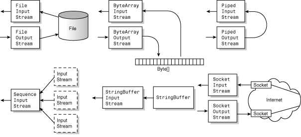 | ByteArrayInputStream ByteArrayOutputStream | In-memory arrays of bytes |