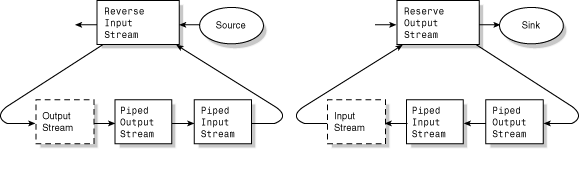 The PipedInputStream and PipedOutputStream classes are interesting because they connect to each other, enabling one part of your Java program to read output produced by another part. Usually the two parts that use the piped streams (called the producer and the consumer) are in different threads, to minimize the possibility of causing a deadlock. However, even in different threads, it's possible to have a deadlock. For example, the consumer might be blocked while waiting on the producer to write more data, while at the same time the producer can't finish computing the data until the consumer takes some additional action. Use the piped streams with care. (See Chapter 6, "Effective Use of Threads," for more information about using Java threads.)
