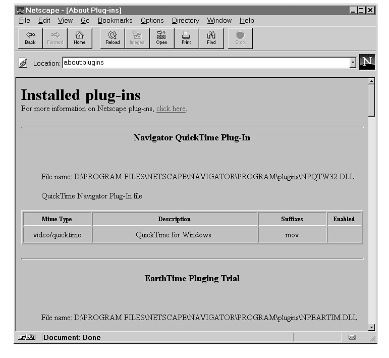 Navigator beta 4 for Windows contains an updated version of the Help | About Plug-ins menu item. The About Plug-ins feature tells you what plug-in you have installed, the full path of each plug-in and its MIME type, its description, its suffixes, and whether it is enabled. Only after Navigator finds a MIME type to which a plug-in is registered is the plug-in loaded into memory and executed. Figure 32.2 shows the Windows Navigator beta 4 About Plug-ins screen.