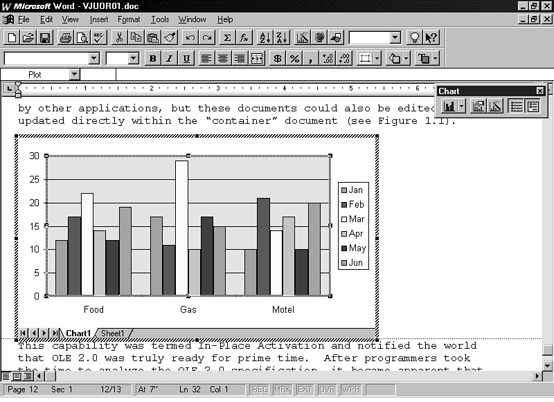 If the user were to edit a Microsoft Word document that contained a chart, the application would appear to be Microsoft Word. However, if the user double-clicked the chart, OLE 2.0 enabled the application to essentially "morph" into Microsoft Excel (see Figure 9.1). The user then could operate on the chart using the Excel menus and options, and immediately switch back to the word processing functionality provided by Word after the chart had been edited.